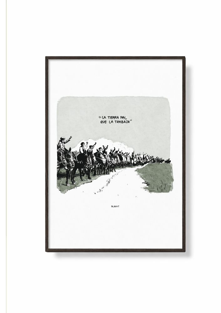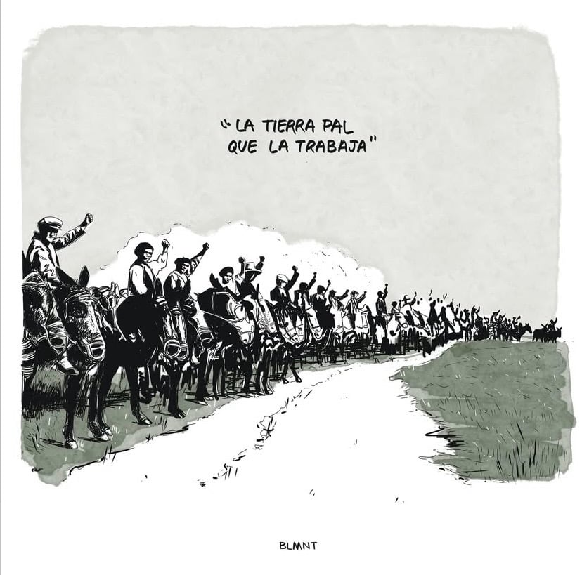 Ilustración inspirada en la rebelión campesina extremeña del 25 de marzo de 1936, para muchos el auténtico Día de Extremadura. Una ocupación organizada y pacífica de campesinos que dejó una imagen histórica: los jornaleros tomando las tierras de Badajoz.